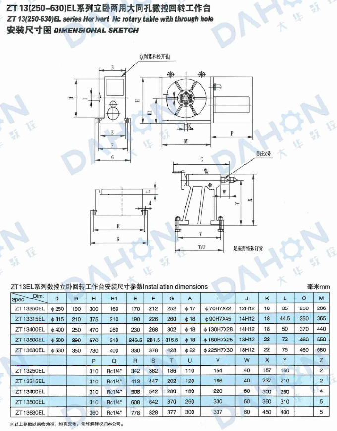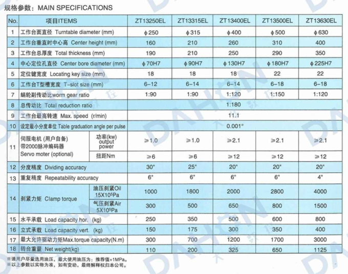 第四軸是各類數(shù)控鏜、銑床和加工中心的關鍵配套附件,可以主軸垂直和水平兩種方式安裝在主機工作臺上,用作主機的第四回轉(zhuǎn)軸。轉(zhuǎn)臺在主機相關控制系統(tǒng)控制下, 可實現(xiàn)等分的和不等分的孔、槽或者連續(xù)特殊曲面的加工,且保證很高的加工精度。 ZT 13E series Hor /vert NC rotary table can carry out the performance of direct and indirect dividing plate proc essing, plateslotting and various cam-curving