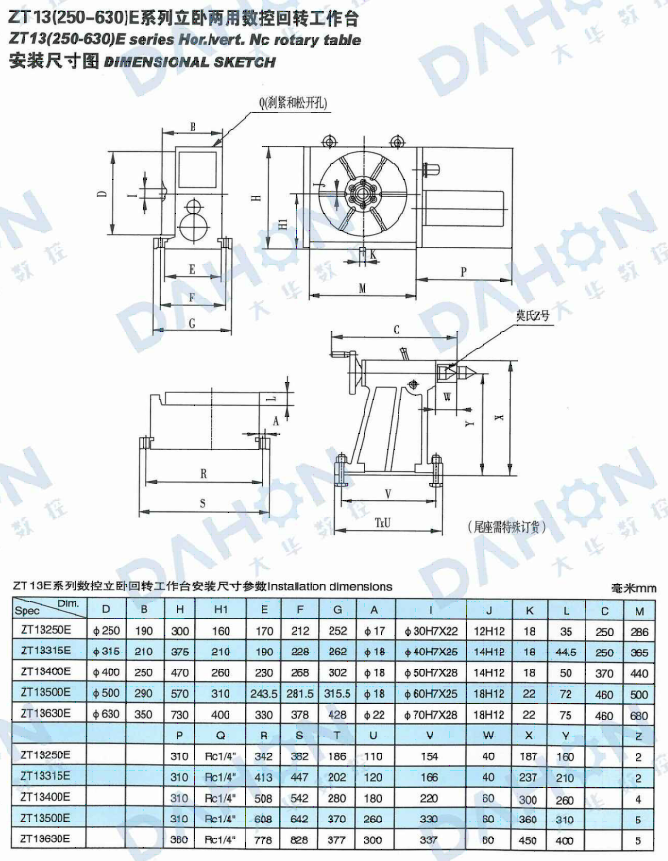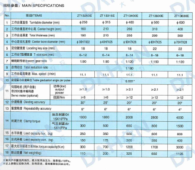 T13E系列數(shù)控立臥回轉工作臺是各類數(shù)控鏗、銑床和加工中 心的關鍵配套附件,可以主軸垂直和水平兩種方式安裝在主機工 作臺上,用作主機的第四回轉釉。轉臺在主機相關控制系統(tǒng)控制下, 可實現(xiàn)等分的和不等分的孔、梏或者連續(xù)特殊曲面的加工,且保證很高的加工精度。 ZT I3E Hor /vert NC rotary table can carry out the performance of direct and indirect dividing plate processing plateslotting and can-cuiving