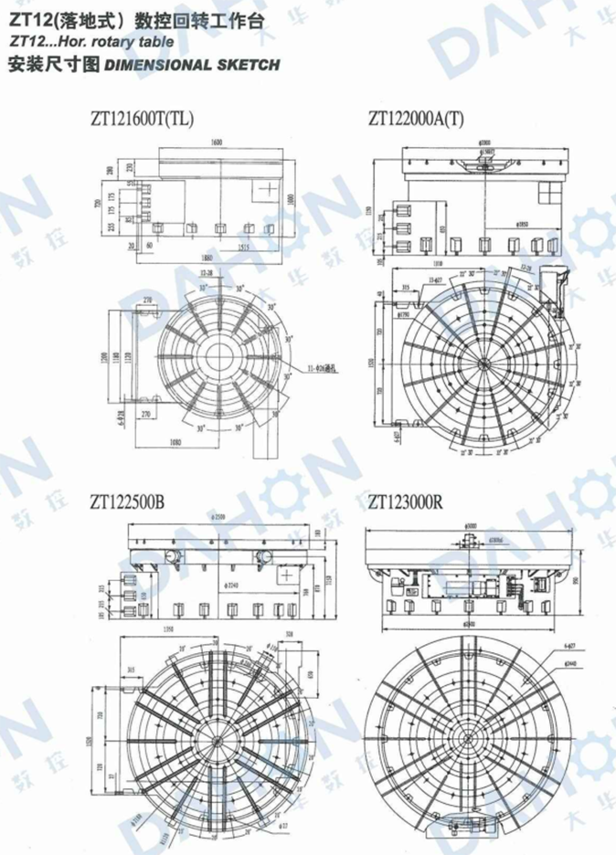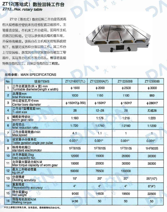 ZT12 (落地式) 數(shù)控回轉(zhuǎn)工作臺是各類大規(guī)格數(shù)控鏜銑床的理想配套功能部件,主軸垂直安裝,作機床工作臺使用,即用作主機的第四回轉(zhuǎn)軸。它可以承受高負載和重車削,并保持高精度。該轉(zhuǎn)臺在主機相關(guān)控制系統(tǒng)控制下,能夠完成各種分度回轉(zhuǎn)工作。其工作臺上安裝板、盤或其他形狀較復(fù)雜的被加工零部件,實現(xiàn)等分白的和不等分的孔、槽或者連續(xù)特殊曲面的加工,且保證很高的加工精度。